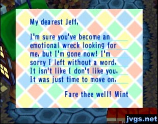 I checked my mail and found a goodbye letter from Mint.Mint's goodbye letter.I went around town pulling weeds and digging up fossils until I stumbled into my newest neighbor, Valise, a kangaroo.  I don’t recall ever seeing Valise before.