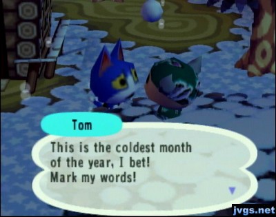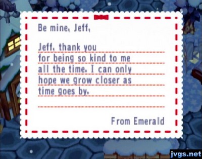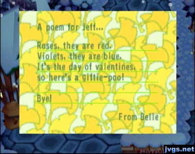 Tutu sent me a No. 1 shirt, Baabara sent me a green tie-dye, Belle sent me a No. 67 shirt, Purrl sent me a U R here shirt, Maple sent me a spade shirt, Candi sent me a cream sofa, Emerald sent me a kiddie couch, and Sydney sent me a crewel shirt. I put on the crewel shirt and saved the green tie-dye; everything else got sold at Nookington’s. I then went around and talked to some of my neighbors.