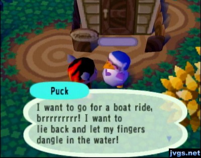 I talked to Puck and he asked me if I have a Game Boy Advance. I told him yes, and he talked about connecting the Game Boy Advance to the GameCube to visit the island. He said he wants to ride the boat and let his fingers dangle in the water. But Puck…you don’t have fingers.