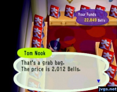 Tom Nook: That's a grab bag. The price is 2,012 bells.Each grab bag contains three items. I bought three grab bags, but most of the items inside them were carpets or wallpapers. I did get a green pinwheel, though.