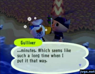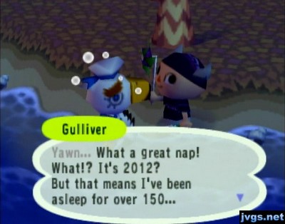 Gulliver: What a great nap! What? It's 2012? So I've been asleep for over 150...Gulliver: ...minutes. Which seems like a long time when I put it that way.He gave me a Lady Liberty, which of course is a model of the Statue of Liberty. I wonder why this item wasn’t included in City Folk? Anyway, I finished pulling some weeds and stopped at the post office before I headed for home and ended my game.