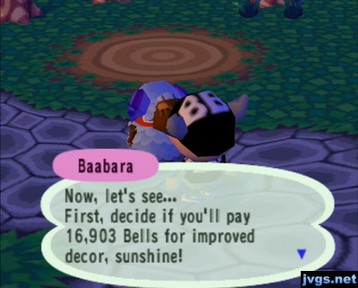 Baabara: Decide if you'll pay 16,903 bells for improved decor!After I said no, she called me an insufferable wimp and told me the item would have been a lovely armchair. I wouldn’t have bought that for 100 bells.