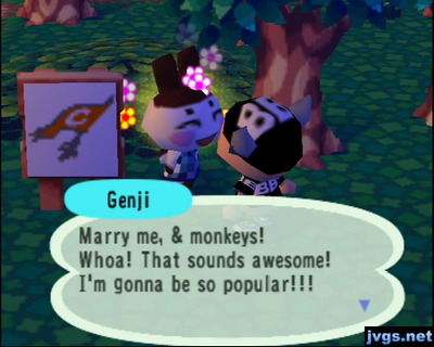 Genji: Marry me, & monkeys!After that, I stopped at the post office to mail away some fossils. I still had a bunch of weeds remaining, so I went around town and picked all that I could find. I then went to the wishing well to make sure my town status was back to perfect.