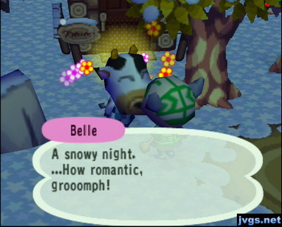 It was snowing in town tonight, and it looked quite pretty. Genji was trying to count the snowflakes, while Static advised me to make my way home before it turns into a blizzard. But Belle just thought the snow was romantic.