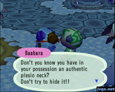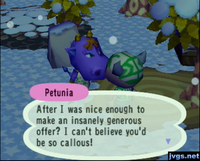 Petunia: After I made a generous offer? You're so callous!After pushing her around a little bit, I resumed my late night walk around town. The daily glowing spot gave me 10,000 bells today. And at the wishing well, Baabara offered me her plaza tile for my plesio neck.
