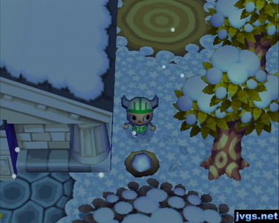 Over by the museum, I pushed a snowball into a hole. Later Animal Crossing games don’t let you do this; the snowball will break as soon as it hits the hole. Even though it serves no purpose, I just like doing weird things like this on GameCube. Just because I can.