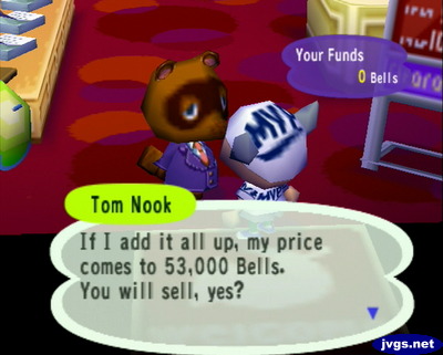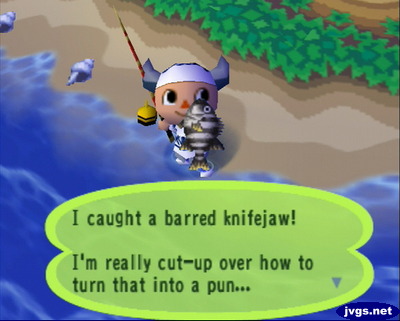 Catching a barred knifejaw in Animal Crossing.I went up to Nookington’s to sell my catches, and I earned a nice 53,000 bells. Not bad for six minutes of fishing!