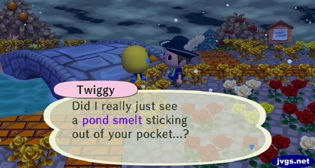 Chow was locked out of his house, so I went fishing for his key. But I ended up catching many fish in the meantime. Twiggy saw a pond smelt sticking out of my pocket, and she wanted it. She traded me a kappa suit for it.
