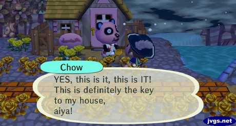 Eventually, I caught Chow’s key in the river and returned it to him. To thank me, he gave me a gyroid. You should invite me over for some chow dinner sometime, dude.