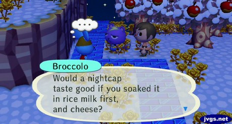 Broccolo and Static were having a conversation right behind my house, and it didn’t make much sense to me. Broccolo wondered if a nightcap would taste good if you soaked it in rice milk. What a weird mouse.