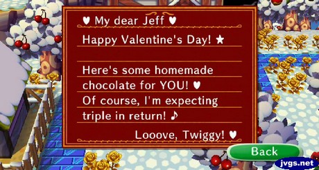 Today is Valentine’s Day, and I got a valentine in the mail from…Twiggy? I wasn’t expecting her to be my valentine, but she did send me a chocolate heart, so I won’t complain too much.