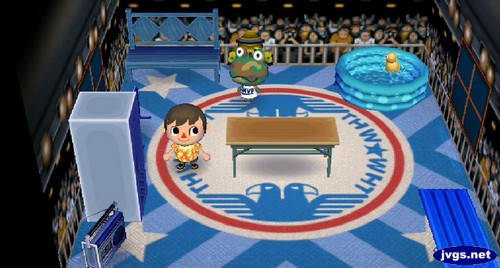 After the show, I saw that Camofrog was home. I went in to see his house, now that he’s all unpacked. A few of his furniture items match the boxing theme, but he certainly seems to like blue furniture in general.