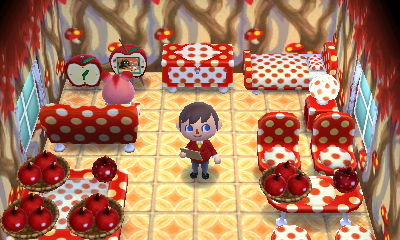 Indoors, I used the forest wall and kitschy tile. The polka-dot furniture set was freshly unlocked for Apple, so I used that, along with the more obvious apple-shaped items and apples themselves.