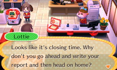 After it uploaded, I closed the game without saving (on purpose) from the home menu. Since I didn't go to my desk and save my game, I thought the game would start me back at the beginning of Day 17. But instead, Lottie greeted me and told me it was closing time! The game saves after an upload, and even something as simple as uploading an existing house takes a full day of game time.