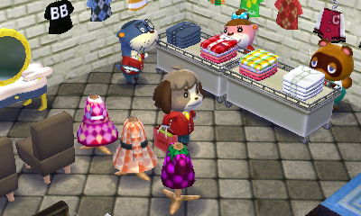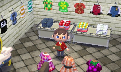 I got the impression this is meant to be a clothing shop (although you can really do anything you want), since many articles of clothing have been unlocked. I put a few outfits on display, and many more hanging on the wall. I also had stacks of clothes available for purchase. I put in a changing area and a mirror so customers can try on the clothes and see how they look. Some chairs are provided for people to wait while their friends try clothes on.