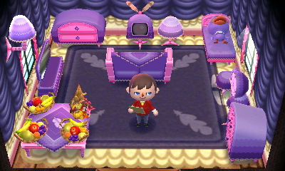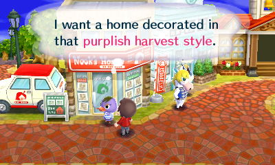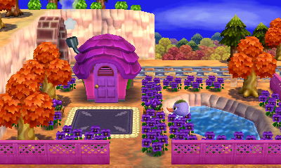 I picked out a location where it appeared to be autumn, since the harvest festival is a fall holiday (better known as Thanksgiving in the U.S.). I would have liked to put some pumpkins around her house, but I haven't unlocked any yet. Other than giving her a few trees and a harvest rug, all I did outdoors was put in a bunch of purple flowers.