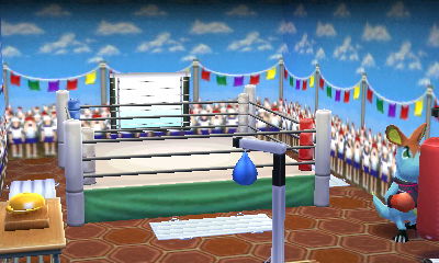 Of course, I put in a full boxing ring indoors. It doesn't leave room for much else, though--even though I chose a larger, eight-by-six room size. But I managed to include a sandbag, a speed bag, and a judge's bell. But shockingly, the ringside seating and boxing ring mat have not been unlocked! That makes absolutely no sense at all for a boxing-themed house. So I ended up using the sporty wall and red tile floor. I also used cheering as the sound scenery; it's a natural fit. As for Rooney and I, we hopped into the ring for some competitive napping.