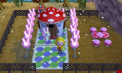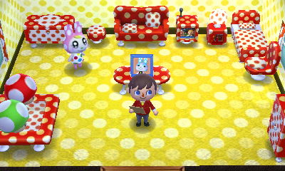 I used the dotted wall and dotted rug indoors, along with the entire polka-dot furniture set. Chrissy insisted on Francine's picture...interesting. I also put a super mushroom and a 1-up mushroom on her table.