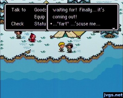 After following a mysterious woman into a hotel, I found out it was a trap. Ness and Paula were locked in a dungeon of sorts. Fortunately, Paula has some psychic abilities, so she sent a telepathic message to some guy named Jeff (what a weird name). So he sneaks out of his dorm (in the land of Winters) to look for the Loch Ness-style sea monster called Tessie. The Tessie-watchers there were so polite.