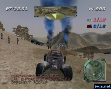 It’s a vehicle-based action game from Rockstar Games. It doesn’t seem to be a very well known game, at least on GameCube. There were also two Smuggler’s Run games on PlayStation 2, although I haven’t played those. At any rate, the main story mode has 36 missions, most of which involve picking up and delivering contraband while avoiding cops. The pick-up and drop-off points will often be indicated by colored smoke.