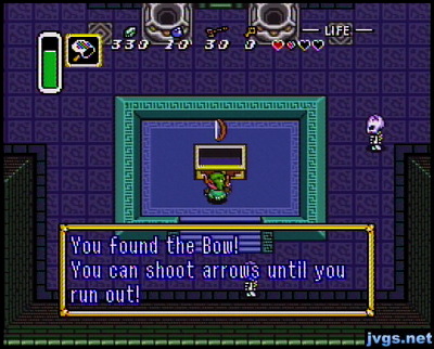 After avoiding an endless stream of bowling balls and defeating wimpy skeletons that fly backwards every time you swing your sword, I acquired the big key. A couple screens later, I used it to open the treasure chest and I got a bow! I like how it tells me I can shoot arrows until I run out.