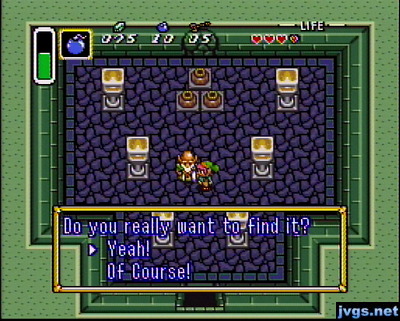 When I left off last time, I was in Kakariko Village. A boy told me the location of the elder I need to see. So today, I headed east to find him. He told me his name is Sahasrahla (bless you!) and he said I need to find three pendants before I can wield the legendary sword. He asked me if I really wanted to find it. The choices were “yeah” and “of course.”