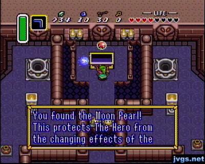 A large treasure chest holds the Moon Pearl, which allows Link to retain his normal shape when entering the Dark World. This allows him to use his normal items, which he can’t do in bunny form.