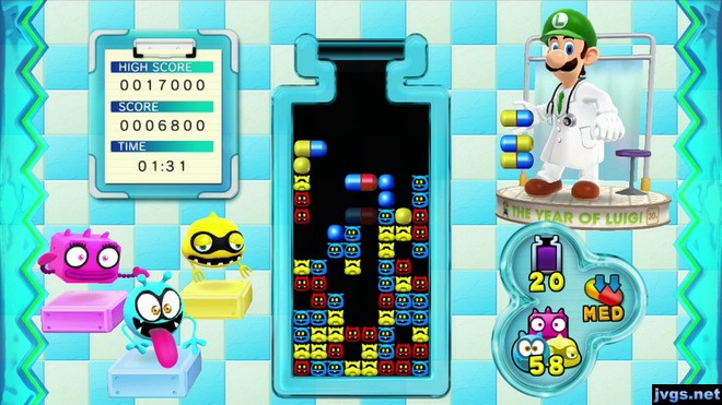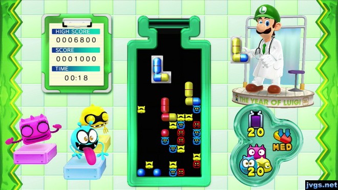 This is the classic Dr. Mario game you all know and love. Or at least, you should love it. Luigi drops colored pills (each with two sections, which may or may not be different colors) and you have to line up four colors in a row to wipe out each virus. Clear the stage of all viruses and advance to the next level.
