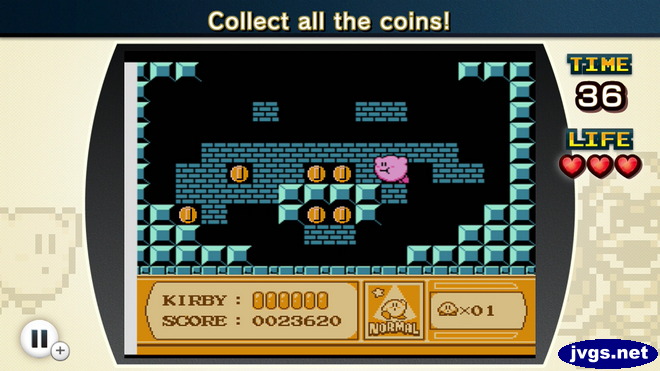 But the highlight of the game is the remix stages. The remix stages may take elements from one game and place them into another, or it may add completely new challenges. For example, Kirby may need to collect coins in a Mario level, or you may need to race on an Excitebike track in the dark. Each challenge has a time limit, and you can earn 1-3 stars depending on how fast you complete the task.