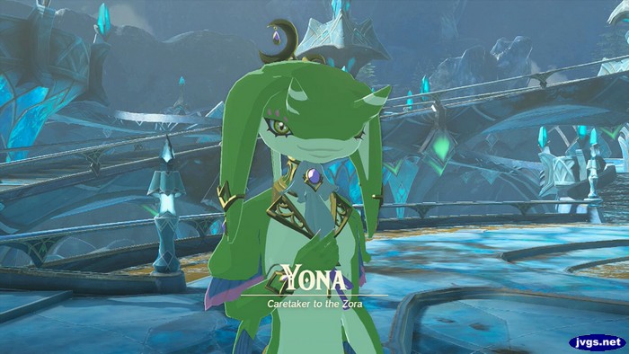 After wandering around more, I found myself at Upland Zorana Skyview Tower. I had to clear away some sludge to activate it. I could see Zora’s Domain from around here, so I floated on down. I cleared some sludge off of a statue that featured some familiar faces, and I met Yoda. Uh, Yona, mean I.
