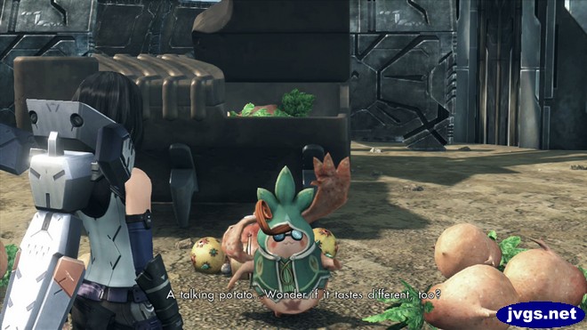As I was finishing up Chapter 3, my team encountered this creature named Tatsu hiding among some other vegetables. We invited him to come along with us, and initially, he seems to be added just for comic relief. Characters refer to him as a potato or a turnip, and they repeatedly threaten to put him in a salad. For some reason, he reminds me of Cait Sith in Final Fantasy VII. I find it hard to bake take him seriously; I don’t think I trust him.