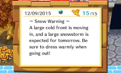 When I was done with my tasks around town, I headed over to town hall to do some work as mayor for a change. With the impending snow storm and my completion of the rose-lined paths, now is the perfect time to switch back to the night owl ordinance. I shouldn’t have to do much flower-watering with the coming snow–and when it doesn’t snow, that will allow my black flowers to wilt. Then I can water them with the gold can to turn them gold. The new ordinance will also be helpful with Friday Night Forest coming up in two days.